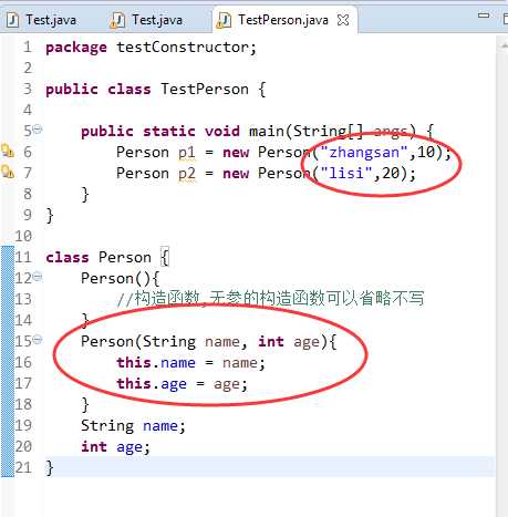 这里有一个问题需要特别注意:默认情况下,一个类会有一个默认的构造函数,这个构造函数没有内容也没有返回值,一般都回略去不写.这种情况下,编译器在编译的时候会默认加上一个无参且方法体为空的构造函数.但是,如果类的构造函数被重写了,如上例,Person类已经有了一个有参数有方法体的构造函数,这时编译器就不会再给它默认加上一个无参且方法体为空的构造函数.可以理解为无参的构造函数被覆盖了.这种情况称为没有默认构造函数.