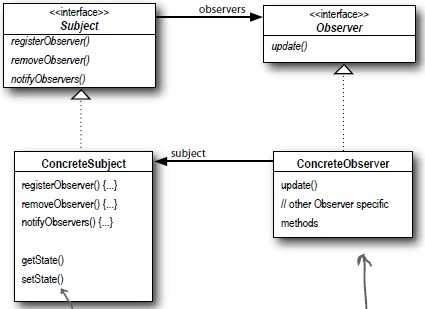 Observer Pattern,说穿了,类似于手机应用里面的“发布-订阅”的形式,有一个Subject接口提供内容的获取,更新,并且Subject需要注册(register)很多个Observer观察者,而具有显示数据功能Display的类将继承Observer接口作为观察者,只有当你在Subject里注册了这个Observer时,Subject一有数据更新就会通知(notify)所有注册的Observers去更新(update)内容。