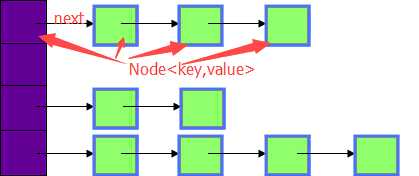通过HashMap数据存储数组Node<K,V>[] table,及数据节点Node<K,V>的数据结构可知:HashMap是实现"key-value键值对"的映射关系的,是通过“拉链法”解决哈希冲突的。简单的构造图如下所示: