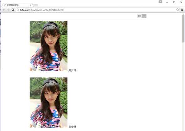 <!DOCTYPE html> <html> <head> <meta charset="utf-8" /> <title>列表样式切换</title> <style> *{ margin: 0; padding: 0; } ul { list-style-type: none; } .box{ width: 789px; height: auto; margin: 0 auto; } .list-box{ margin: 0 auto 10px; width: 700px; height: 42px; border-bottom: 1px solid #eee; } .list{ float: right; padding-top: 10px; } .list-box ul li{ cursor: pointer;/*变手*/ width: 30px; height: 26px; float: left; display: block; background: url("img/listype-icon.png") no-repeat; } .changelist .list-1-o{ height: 360px; width: 240px; border: 1px solid #aaaaaa; float: left; margin-left: 20px; margin-bottom: 20px; } .changelist .list-2-v{ height: 360px; } </style> <script src="http://libs.useso.com/js/jquery/1.11.1/jquery.js"></script> <script> $(document).ready(function(){ $(".list-1").bind("click",function(){ $(".list-1").css("backgroundPosition","0px -26px"); $(".list-2").css("backgroundPosition","-30px -26px"); $(".changelist").children().removeClass("list-2-v").addClass("list-1-o"); }) $(".list-2").bind("click",function(){ $(".list-1").css("backgroundPosition","0px 0px"); $(".list-2").css("backgroundPosition","-30px 0px") $(".changelist").children().removeClass("list-1-o").addClass("list-2-v"); }) }); </script> </head> <body> <div class="box"> <div class="list-box"> <ul class="list"> <li class="list-1" id="list-1" style="background-position: 0px -26px;"></li> <li class="list-2" id="list-2" style="background-position: -30px -26px;"></li> </ul> </div> <div> <ul class="changelist"> <li class="list-1-o"> <div class="lesson-info"> <img src="http://cnm0.book17.com/p6/girl13.com-2014-08-21-17-10-18_58.jpg" style="width: 240px"> <span>美女呀</span> </div> </li> <li class="list-1-o"> <div class="lesson-info"> <img src="http://cnm0.book17.com/p6/girl13.com-2014-08-21-17-10-18_58.jpg" style="width: 240px"> <span>美女呀</span> </div> </li> <li class="list-1-o"> <div class="lesson-info"> <img src="http://cnm0.book17.com/p6/girl13.com-2014-08-21-17-10-18_58.jpg" style="width: 240px"> <span>美女呀</span> </div> </li> <li class="list-1-o"> <div class="lesson-info"> <img src="http://cnm0.book17.com/p6/girl13.com-2014-08-21-17-10-18_58.jpg" style="width: 240px"> <span>美女呀</span> </div> </li> <li class="list-1-o"> <div class="lesson-info"> <img src="http://cnm0.book17.com/p6/girl13.com-2014-08-21-17-10-18_58.jpg" style="width: 240px"> <span>美女呀</span> </div> </li> <li class="list-1-o"> <div class="lesson-info"> <img src="http://cnm0.book17.com/p6/girl13.com-2014-08-21-17-10-18_58.jpg" style="width: 240px"> <span>美女呀</span> </div> </li> <li class="list-1-o"> <div class="lesson-info"> <img src="http://cnm0.book17.com/p6/girl13.com-2014-08-21-17-10-18_58.jpg" style="width: 240px"> <span>美女呀</span> </div> </li> <li class="list-1-o"> <div class="lesson-info"> <img src="http://cnm0.book17.com/p6/girl13.com-2014-08-21-17-10-18_58.jpg" style="width: 240px"> <span>美女呀</span> </div> </li> <li class="list-1-o"> <div class="lesson-info"> <img src="http://cnm0.book17.com/p6/girl13.com-2014-08-21-17-10-18_58.jpg" style="width: 240px"> <span>美女呀</span> </div> </li> </ul> </div> </div> </body> </html>