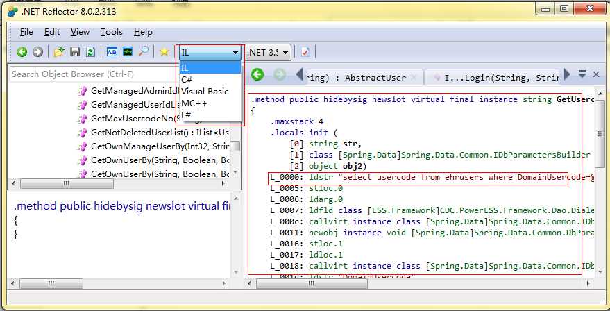 首先我用Reflector查看到相应的方法代码(C#代码),也就是我要修改的那个字符串所在的方法。然后在Reflector工具的上方有个下拉菜单