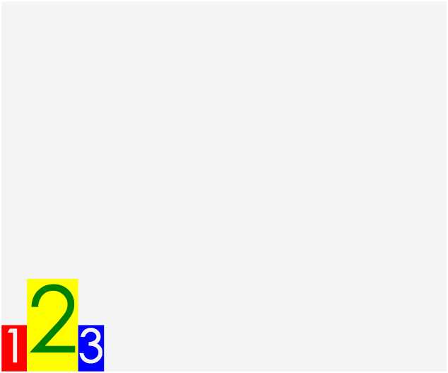 .child1{ background-color: red; color: #f4f4f4; font-size: 100px; } .child2{ background-color: yellow; color: green; font-size: 200px; } .child3{ background-color: blue; color: #f4f4f4; font-size: 100px; } </style> </head> <body> <div class="father"> <div class="child1">1</div> <div class="child2">2</div> <div class="child3">3</div> </div> </body> </html>