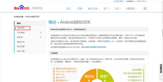 回到android 定位SDK首页(此处可以是任意Android 地图SDK、Android导航SDK等首页)。点击“获取密钥”