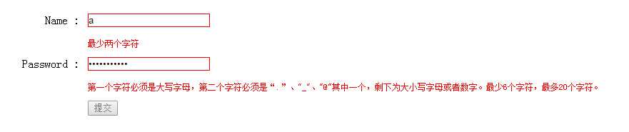 1 <!DOCTYPE html> 2 <html ng-app="myApp"> 3 <head> 4 <script src="js/angular.js"></script> 5 <script src="demo.js"></script> 6 <link href="demo.css" rel="stylesheet" type="text/css"/> 7 </head> 8 <body> 9 <div ng-controller="myController" ng-init="init()"> 10 <form name="myForm" ng-submit="alertOk()"> 11 <div> 12 <label for="myName">Name :</label> 13 <input type="text" ng-model="name" required ng-maxlength=20 ng-minlength=2 name="myName" id="myName" placeholder="请输入姓名"></p> 14 <div ng-if="myForm.myName.$dirty && myForm.myName.$error.required" class="errorinfo labelmargin">姓名必须填写</div> 15 <div ng-if="myForm.myName.$dirty && myForm.myName.$error.maxlength" class="errorinfo labelmargin">不能超过20个字符</div> 16 <div ng-if="myForm.myName.$dirty && myForm.myName.$error.minlength" class="errorinfo labelmargin">最少两个字符</div> 17 </div> 18 19 <div> 20 <label for="myPwd">Password :</label> 21 <input type="password" ng-model="pwd" required name="myPwd" id="myPwd" placeholder="请输入密码" ng-pattern="/^[A-Z][\_\@\.]([a-zA-Z0-9]){4,19}$/"></p> 22 <div ng-if="myForm.myPwd.$dirty && myForm.myPwd.$error.required" class="errorinfo labelmargin">密码必须填写</div> 23 <div ng-if="myForm.myPwd.$dirty && myForm.myPwd.$error.pattern" class="errorinfo labelmargin">第一个字符必须是大写字母,第二个字符必须是“.”、"_"、"@"其中一个,剩下为大小写字母或者数字。最少6个字符,最多20个字符。</div> 24 </div> 25 <input type="submit" id="submitbtn" ng-disabled="myForm.$invalid"class="labelmargin"/> 26 </form> 27 </div> 28 </body> 29 </html>