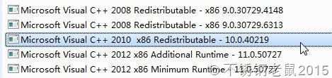 然后安装VS2010SP1,这虽然只是VS2010的一个补丁,却也有1.5G,最好安装离线版,因为在线安装非常容易中断。安装之前要先卸载掉比Microsoft Visual C++ 2010 x86(x64) Redistributable - 10.0.30319更高的版本(不用卸这个版本),比如11.0.XXXXX等。下图中这个10.0.40219就得卸载掉,后面这个VS2012的补丁最好也卸载掉吧(没在下图这台电脑上试验过,不过如果没装VS2012的话还是卸载掉好)
