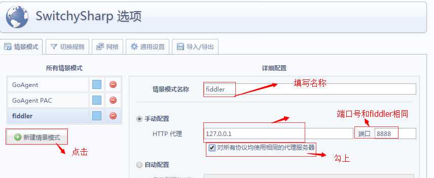 1. 建议装一个SwitchySharp的Chrome插件,为fiddler创建一个规则,代理到本地的8888端口(fiddler所用的端口)。安装SwitchySharp步骤可以看我这篇博客,如下: