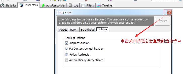 Composer选项卡支持手动构建和发送HTTP,HTTPS和FTP请求,我们还可以从web session列表中拖曳session,把它放到composer选项卡中,当我们点击Execute按钮,把请求发送到服务器端。