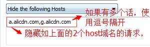 Hide the following Hosts的含义是:隐藏下面文本框中指定的域名下的数据流;如下所示: