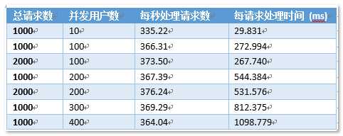 我们使用的轻量级的ab来做压力测试,如果不熟悉ab的可以点这里,下面是测试的结果: