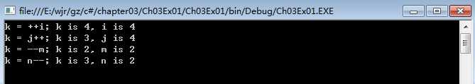 using System; using System.Collections.Generic; using System.Linq; using System.Text; using System.Threading.Tasks; namespace Ch03Ex01 { class Progra { static void Main( string[] args ) { int i, j, m, n; i = j = m = n = 3; int k = 0; k = ++i; Console.WriteLine( "k = ++i; k is {0}, i is {1}", k, i ); k = 0; // init k = j++; Console.WriteLine( "k = j++; k is {0}, j is {1}", k, j ); k = 0; // init k = --m; Console.WriteLine( "k = --m; k is {0}, m is {1}", k, m ); k = 0; // init k = n--; Console.WriteLine( "k = n--; k is {0}, n is {1}", k, n ); Console.ReadKey(); } } }