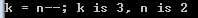 后缀是:先将操作数的值返回给表达式(示例里:返回给k),再对操作数自己本身进行处理(示例里:j, n ),如下: