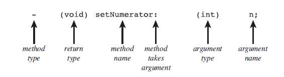 -(void) setNumerator:(int)n; 当见方法中使用":",表明这个方法是带有参数的。(int)参数类型是整形,参数名称为n。