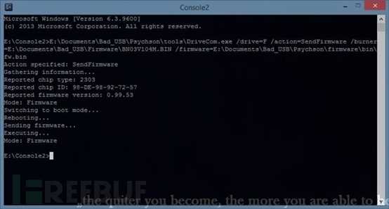 DriveCom将我们U盘切换成固件刷新自动启动模式。现在我们的U盘变成了我们无法切换模式的键盘,同时我们也无法访问内存,但这仅仅是个小问题。在下一节中,我将着重讲述如何解决这个问题。