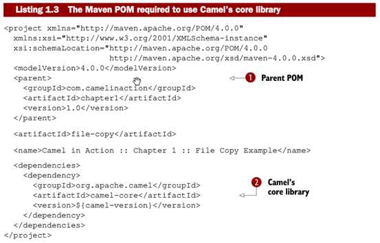 Camel基于EIPs是沉重的。尽管EIPs描述了集成问题的解决方案,同时也提供了通用的词汇列表,但这些词汇列表没有形成书面语言。Camel就避免了这个问题,它提供了一种集成描述性语言。在EIPs和camel的DSL语言之间几乎有一种一对一的关系。