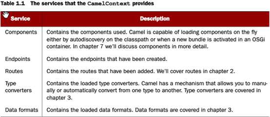 你可能已经猜到CamelContext是一个有类别容器,从figure1.6的插图你可能认为它是camel的运行环境系统。Figure1.7展示了大部分值得注意的服务。这些服务都是camel保留下来的。如下插图:
