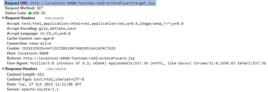 我的代码里面已经写好了,redirectAndFoward.jsp页面上有一个表单,表单重定向到redirectAndFowardTarget.jsp,那么这一次的重定向过程为:
