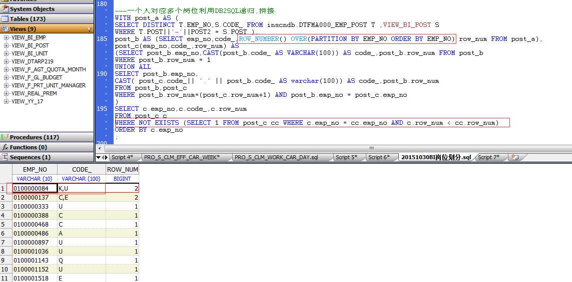 WITH post_a AS ( SELECT DISTINCT T.EMP_NO,S.CODE_ FROM inscndb.DTFMA000_EMP_POST T ,VIEW_BI_POST S WHERE T.POST||‘-‘||POST2 = S.POST ), post_b AS (SELECT emp_no,code_,ROW_NUMBER() OVER(PARTITION BY EMP_NO ORDER BY EMP_NO) row_num FROM post_a), post_c(emp_no,code_,row_num) AS (SELECT post_b.emp_no,CAST(post_b.code_ AS VARCHAR(100)) AS code_,post_b.row_num FROM post_b WHERE post_b.row_num = 1 UNION ALL SELECT post_b.emp_no, CAST( post_c.code_|| ‘,‘ || post_b.code_ AS varchar(100)) AS code_,post_b.row_num FROM post_b,post_c WHERE post_b.row_num=(post_c.row_num+1) AND post_b.emp_no = post_c.emp_no ) SELECT c.emp_no,c.code_,c.row_num FROM post_c c WHERE NOT EXISTS (SELECT 1 FROM post_c cc WHERE c.emp_no = cc.emp_no AND c.row_num < cc.row_num) ORDER BY c.emp_no ;