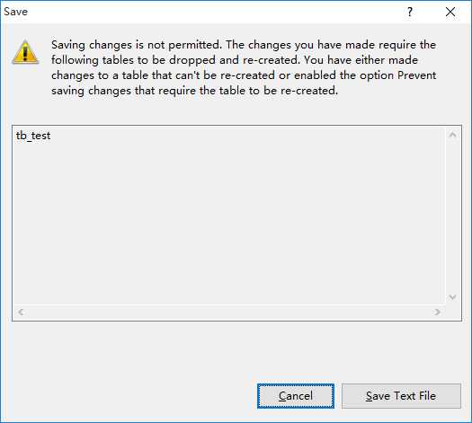 Saving changes is not permitted. The changes you have made require the following tables to be dropped and re-created. You have either made changes to a table that can‘t be re-created or enabled the option Prevent saving changes that require the table to be re-created.