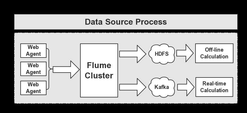 Kafka生产的数据,是由Flume的Sink提供的,这里我们需要用到Flume集群,通过Flume集群将Agent的日志收集分发到 Kafka(供实时计算处理)和HDFS(离线计算处理)。关于Flume集群的Agent部署,这里就不多做赘述了,不清楚的同学可以参考《高可用Hadoop平台-Flume NG实战图解篇》一文中的介绍,下面给大家介绍数据来源的流程图,如下图所示: