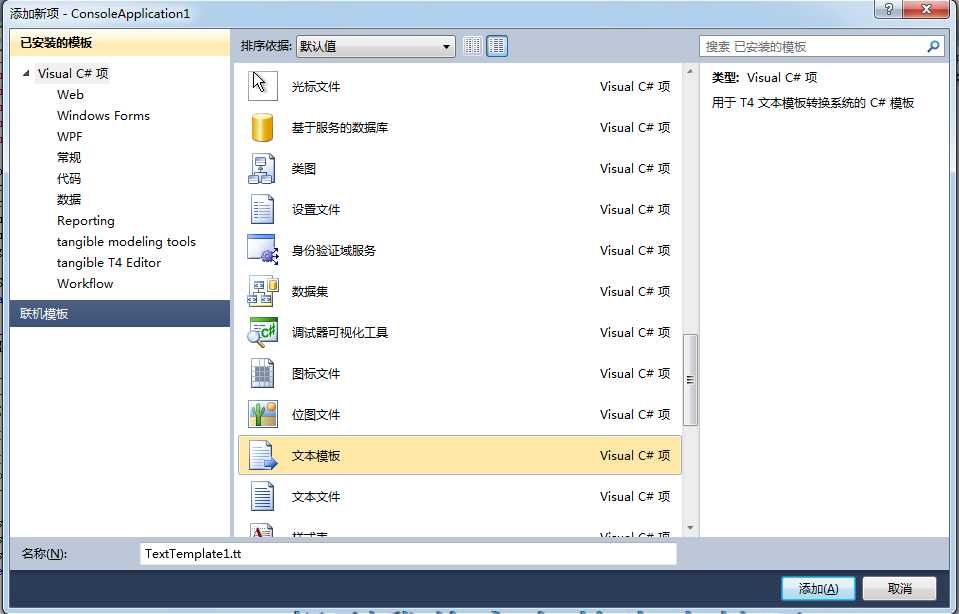 若要创建设计时模板,请向您的项目中添加“文本模板”文件。 另外,您还可以添加纯文本文件并将其“自定义工具”属性设置为“TextTemplatingFileGenerator”。