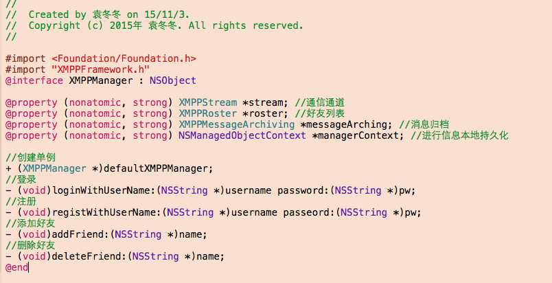3.创建单例类(XMPPManager.h/XMPPManager.m)管理器
