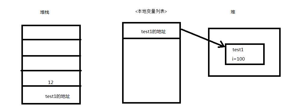 堆栈中存放12,test1的地址,<本地变量列表>第一个变量中存放的是test1的地址,堆中存放的是test1指向的一个对象,其中test1.i=100