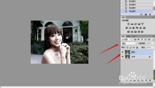 4、若设置图层1的混合模式为【叠加】,则图片加强对比度。如下图所示。