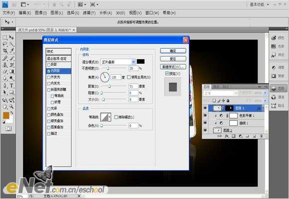 <图9.02> 10、显示并选择“图层3”,单击添加图层蒙版按钮为其添加图层蒙版,得到如图10.01所示效果,此时蒙版中状态如图10.02所示。单击添加图层样式按钮,在弹出的菜单中选择“内阴影”命令,并设置其对话框参数如图10.03所示,得到如图10.04效果。