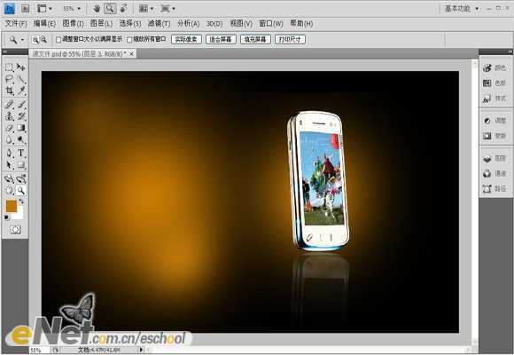 <图7.02> 8、打开“素材2”,如图8.01所示,使用移动工具将其移动到当前画布中,放置在右侧手机的位置,按Ctrl+T组合键调出自由变换控制框,缩小图像后用鼠标右键单击自由变换框,在弹出的菜单中选择“斜切”命令,对图像进行调整后得到如图8.02所示效果,同时得到“图层3”,按“Enter”键确认操作。