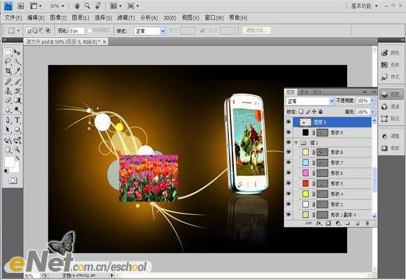 <图23.03> 24、参考步骤23的操作,继续将素材4、5、6、7拖入,并制作出如图24所示效果。制作好以后选择“形状9”到“图层8”之间所有图层,按Ctrl+G组合键将选中的图层编组,得到“组3”,如图24里的“图层”调板所示。