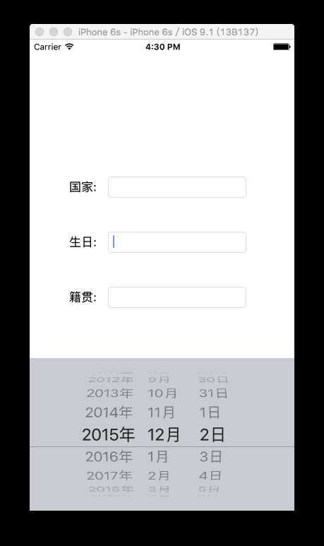 实现这种效果采取的方案是自定义一个TextField.修改它的弹出键盘为 个UIPickView.