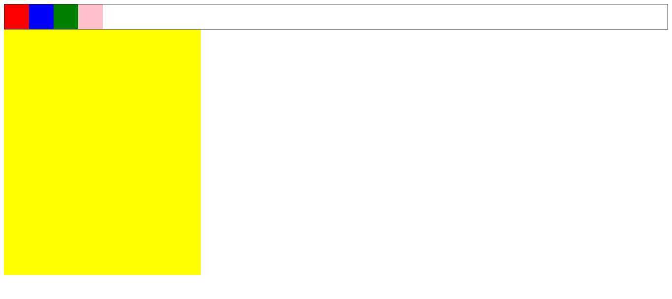 <html xmlns="http://www.w3.org/1999/xhtml"> <head> <meta http-equiv="Content-Type" content="text/html; charset=utf-8" /> <title>浮动的影响</title> <style type="text/css"> .div1,.div2,.div3,.div4{ width:50px; height:50px; float:left; } .div1{ background:red; } .div2{ background:blue; } .div3{ background:green; } .div4{ background:pink; } .box{ border:1px solid black; } .box1{ width:100px; height:200px; background:yellow; } </style> </head> <body> <div class="box"> <div class="div1"></div> <div class="div2"></div> <div class="div3"></div> <div class="div4"></div> </div> <div class="box1"></div> </body>