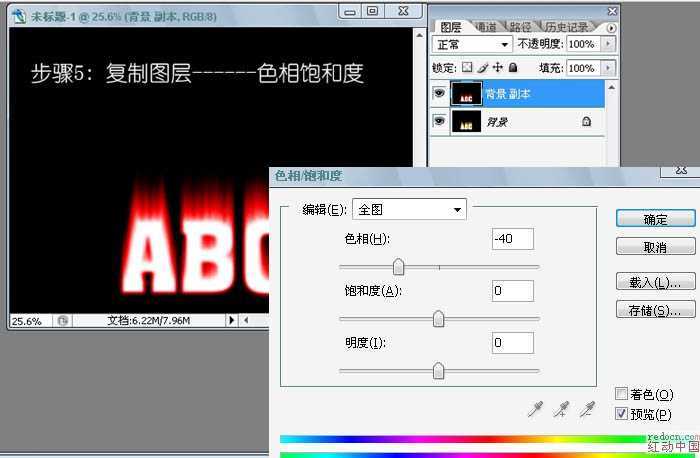 5、把背景图层复制一层,按Ctrl + U 对背景副本调整色相/饱和度,参数设置如下图。