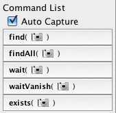 As a convenience, Sikuli IDE provides a Command List on the left panel. It shows a list of the most often used functions. Camera icons in the functions indicate these functions expect a captured image as an argument.