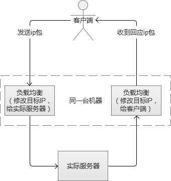在负载均衡服务器收到客户端的IP包的时候,会修改IP包的目标IP地址或端口,然后原封不动地投递到内部网络中,数据包会流入到实际Web服务器。实际服务器处理完成后,又会将数据包投递回给负载均衡服务器,它再修改目标IP地址为用户IP地址,最终回到客户端。