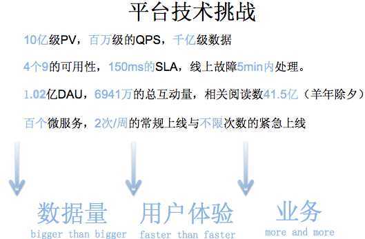 我们通过通过数据看一下它的挑战,PV是在10亿级别,QPS在百万,数据量在千亿级别。我们可用性,就是SLA要求4个9,接口响应最多不能超过150毫秒,线上所有的故障必须得在5分钟内解决完。如果说5分钟没处理呢?那会影响你年终的绩效考核。2015年微博DAU已经过亿。我们系统有上百个微服务,每周会有两次的常规上线和不限次数的紧急上线。我们的挑战都一样,就是数据量,bigger and bigger,用户体验是faster and faster,业务是more and more。互联网业务更多是产品体验驱动, 技 术 在 产 品 体验上最有效的贡献 , 就是你的性能 越来越好 。 每次降低加载一个页面的时间,都可以间接的降低这个页面上用户的流失率。