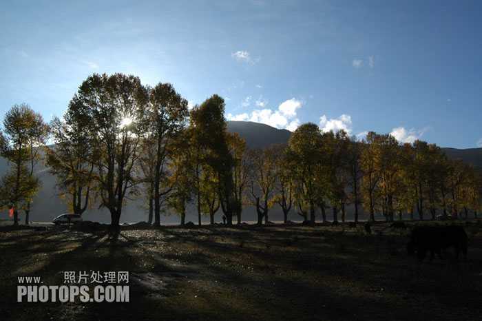 13、很明显,图像中地面、树木的色调变暖,阳光显得更通透、强烈。