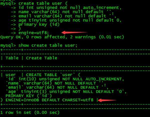 此外,还可以在创建表时指定表的字符集CREATE TABLE `user` ( `id` int(10) unsigned NOT NULL AUTO_INCREMENT, `name` varchar(64) NOT NULL DEFAULT ‘‘, `email` varchar(64) NOT NULL DEFAULT ‘‘, `age` tinyint(3) unsigned NOT NULL DEFAULT ‘0‘, PRIMARY KEY (`id`) ) ENGINE=InnoDB DEFAULT CHARSET=utf8;