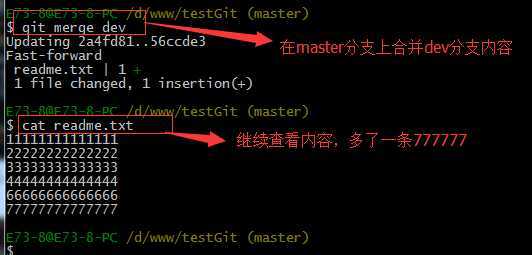 git merge命令用于合并指定分支到当前分支上,合并后,再查看readme.txt内容,可以看到,和dev分支最新提交的是完全一样的。