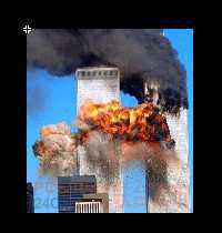 2、按快捷键Ctrl F8打开“创建新元件”面板,创建一个名为“影片”的影片剪辑元件。接着在其编辑场景中按快捷键Ctrl R导入一张图片(世贸大楼被“砸”的图片)。注意,让图片的左上角顶点和场景的中心重叠,如图1所示。可以按快捷键Ctrl I打开“信息“面板进行辅助设置,如图2所示。