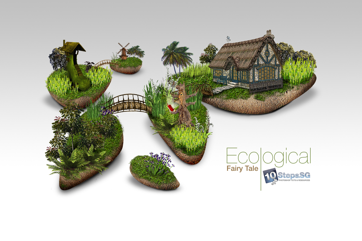 效果 图预览: 原创作者: Johnson Koh:a graphic and web designer in Singapore. Founded 10Steps.SG in August 2008 with the purpose to share my experiments and interesting design news. 转自:http://10steps.sg/tutorials/photoshop/creating-an-ecological-fairy-tale-wallpaper/ PS真功夫分析:先别急着做,先仔细看看我们要做的效果图。 想 一想该如何去完成。最基本的思路:最先收集好各种素材—做背景–接着做个“小岛”的模型–添加素材–整体调整。 这个教程关键的地方: 1、素材的使用。(再次强调,好的素材会让你事半功倍。别不花时间去找素材!) 2、影调的调整,这样才会立体。 3、需要你细心,仔细的做。慢慢的做。不要急出效果。(其实做每个图片都是要这样 的。) OK,带上你的这些准备工作,开始 学习我们今天的教程吧。 第一步:新建一个文档1200×800 pixels 填充一 个线性渐变背景,颜色#CCCCCC — #FFFFFF 第二步:我们开始制作基本模型 新建一层 选择钢笔工具(P) 可以根据鹅卵石的形状画出样子,颜色随便 重复上面的步骤,多画几个,位置安排自己 搞定咯!