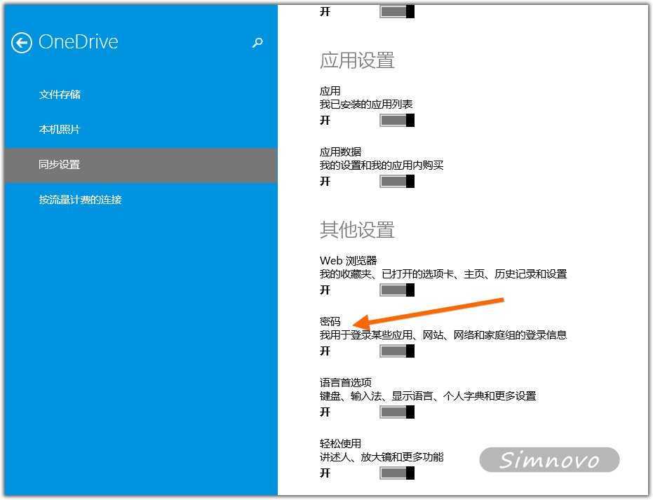 在Windows 8.1中依次打开设置→更改电脑设置→OneDrive→同步设置,