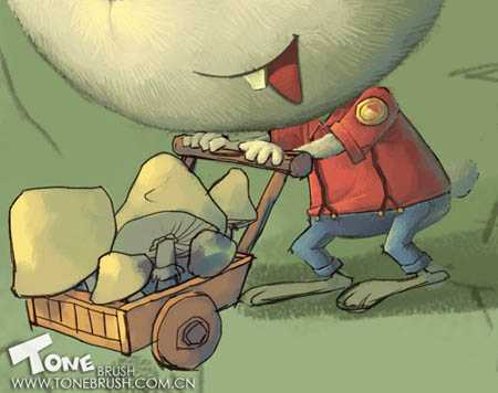 12、给蘑菇增加了一些白色小点装饰,呵呵,这个应该是儿童插画中最像蘑菇的蘑菇了吧。小车也一同描绘出来,小车的处理注意到了转折结构处的强化表现,还有就是颜色冷暖变化的对比 ,要求出来的效果简洁又充分;