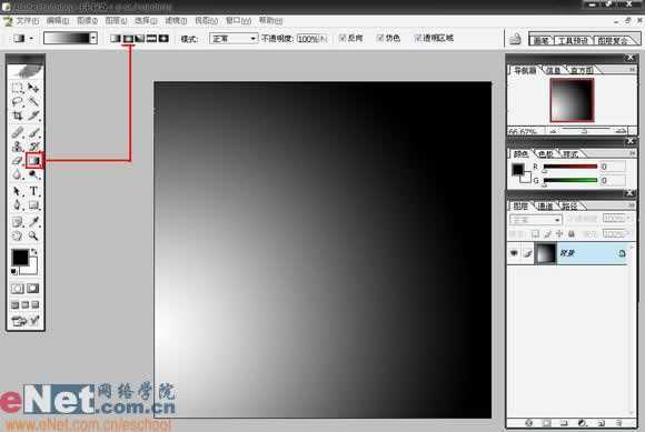 一、在背景层中用渐变工具拖出一个如图圆形渐变。