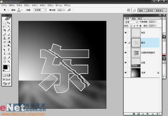 十一、载入“东”的选区,收缩一定量的像素后,清除两个盖印复制层中内容。