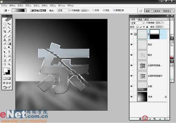 十六、用蓝色填充这个选区,并删除字外面的色块。并添加一个蒙板,在蒙板上使用黑白渐变。以做出反光渐无的效果。