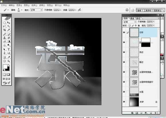 八、删除文字层后,并没发现有文字,这是因为字和其后面的背景是同一个颜色,所以湮没在背景中了。下面是要将其呈现出来。