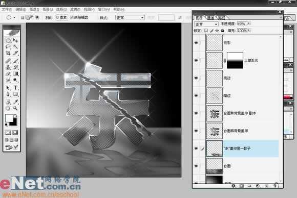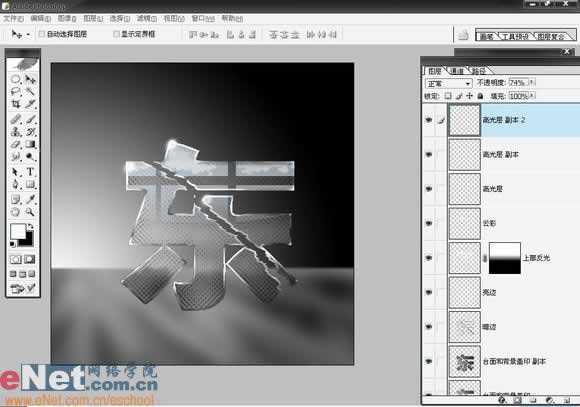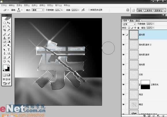 十三、用橡皮檫工具,在亮边层上不断轻擦,以露出后面的暗边,模仿出玻璃边复杂的光感。