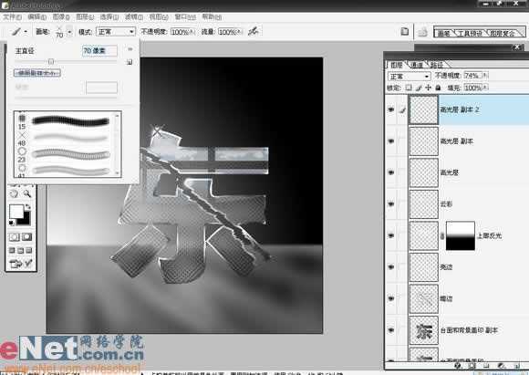 二十二、用湿边画笔,在新建图层上,画上玻璃的调光,如图。