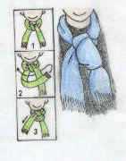 领带结:A把圍巾繞在脖子上,右邊在上,把後邊那段圍巾沿箭頭方向在左邊那段上繞一圈。B:繞好後,再將圍巾從空隙中穿出。C:把圍巾從空隙中抽出來。特別提醒:打法和打領帶差不多,不過打出來的結會顯得有寫臃腫,用薄一點的絲巾。
